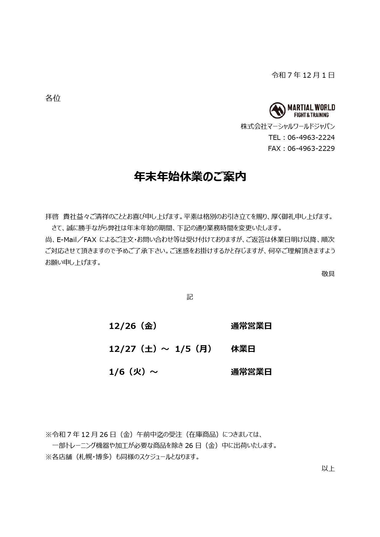 年末年始休業のご案内