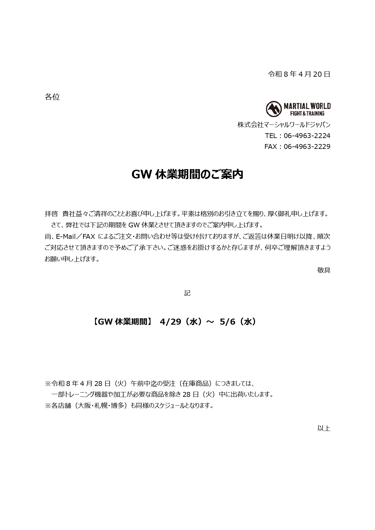 GW休業のご案内
